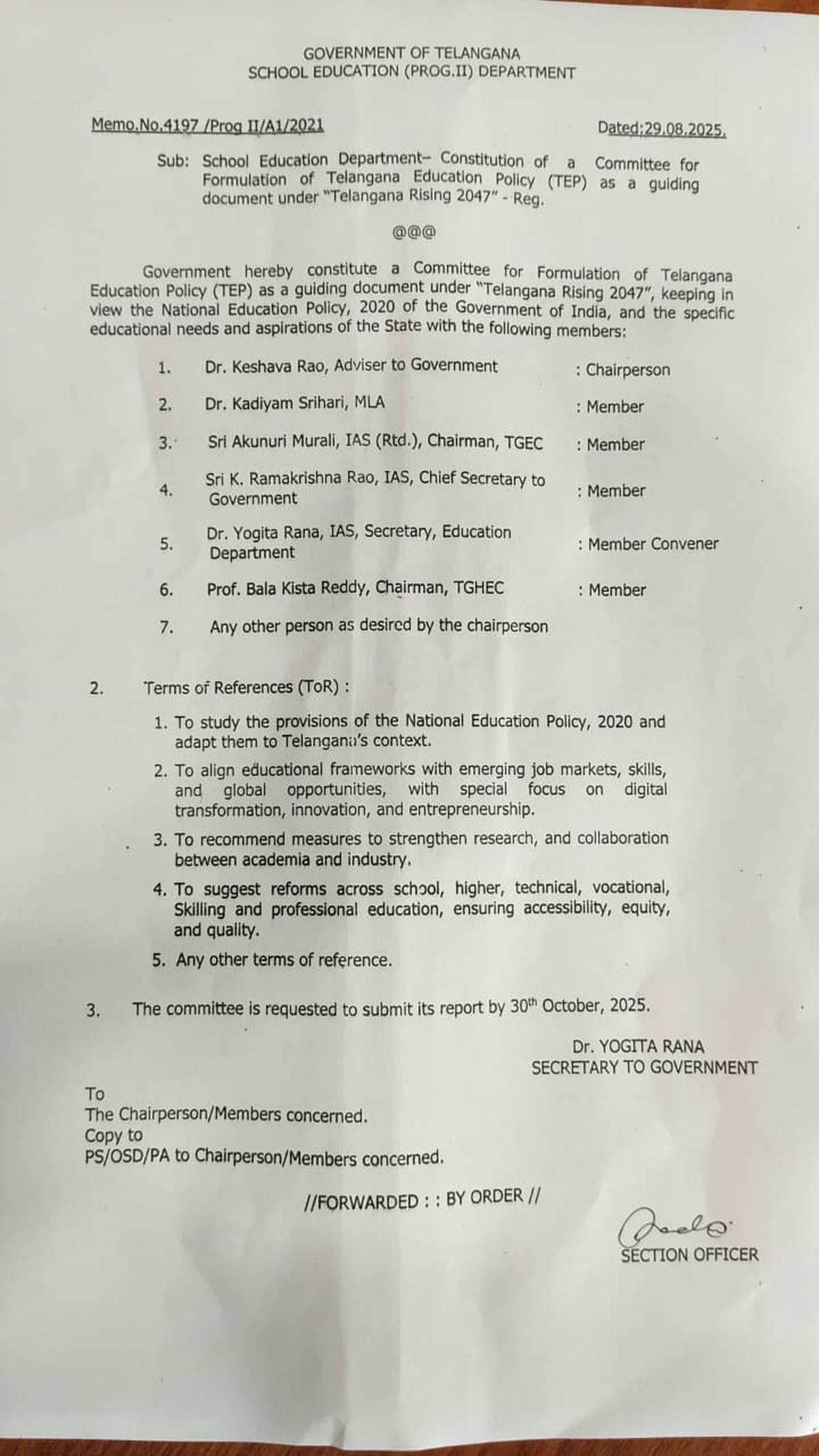तेलंगाना शिक्षा नीति के निर्माण के लिए एक समिति का गठन सरकार द्वारा किया गया था।