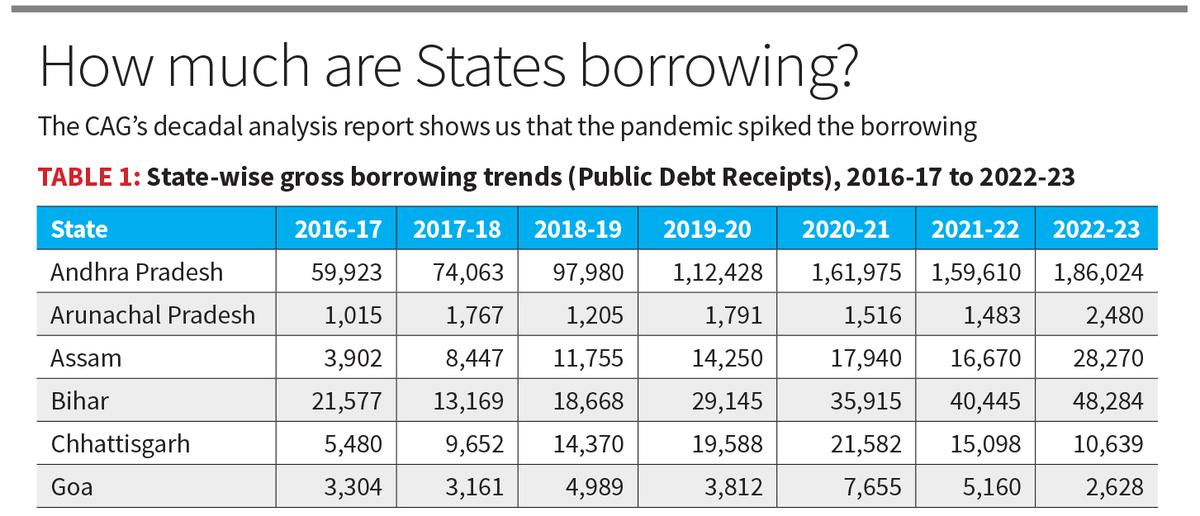 आइए सीएजी की डिकैडल विश्लेषण रिपोर्ट से संख्याओं का विश्लेषण करें। जब राज्य जितना कमाते हैं उससे अधिक खर्च करते हैं, तो वे अधिक उधार लेते हैं। वे मुख्य रूप से ऋण या बॉन्ड के माध्यम से घाटे को पूरा करते हैं जिन्हें ब्याज के साथ चुकाया जाना चाहिए। CAG, अपने ऑडिट किए गए राज्य वित्त रिपोर्टों के माध्यम से, हमें एक समेकित राष्ट्रीय चित्र लाता है, जबकि RBI का राज्य वित्त: ए स्टडी ऑफ बुडगेट्स रिपोर्ट Commarmon के लिए सहमति प्रदान करती है। Togeger लिया गया, इन स्रोतों से पता चलता है कि 2016-17 और 2022-23 के बीच उधार लेने वाले पैटर्न भारत में तेजी से तेजी से कम हो गए हैं।