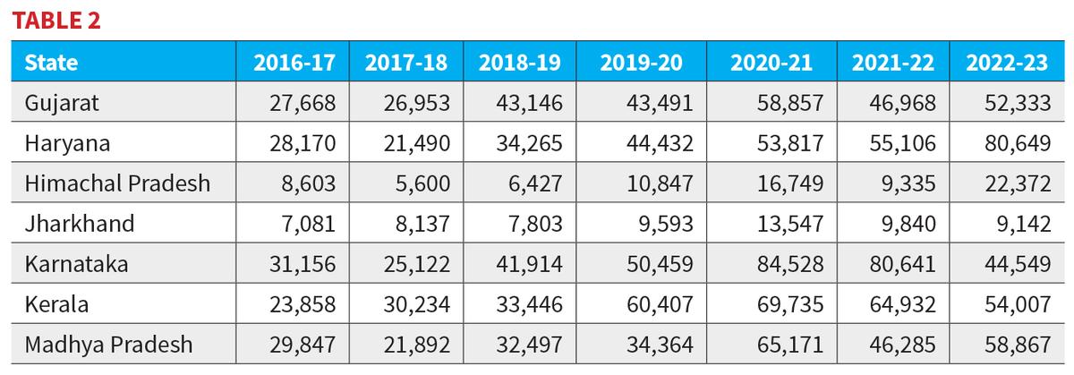 तालिका 2 गुजरात, हरियाणा, हिमाचल प्रदेश, झारखंड, कर्नाटक, केरल और मध्य प्रदेश से संबंधित हैं। यहाँ, उधार एक मापा लेकिन लगातार तरीके से बढ़े। हरियाणा 2016-17 में on 28,170 करोड़ से बढ़कर 2022-23 में ₹ 80,649 करोड़ हो गई, अमीर राज्यों में से एक होने के बावजूद लगभग अपने उधार को तीन गुना कर दिया; इसकी देयता भी GSDP के लगभग 31% तक चढ़ गई। गुजरात धीरे-धीरे ऊपर की ओर बढ़ गया, of 27,668 करोड़ से, 52,333 करोड़ तक, जबकि जीएसडीपी के 19-20% के पास अपने ऋण का बोझ स्थिर रखते हुए। मध्य प्रदेश ने भी अपने उधार को लगभग दोगुना कर दिया, जो कि ₹ 29,847 करोड़ से लेकर ₹ 58,867 करोड़ हो गया, जिसमें देयता लगभग 29%हो गई।