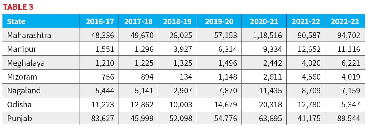 टेबल तीन महाराष्ट्र, मणिपुर, मेघालय, मिज़ोरम, नागालंद, ओडिशा और पंजाब से संबंधित हैं। यह क्लस्टर एक्सट्रम्स को हाइलाइट करता है। 20222-23 में ₹ 94,702 करोड़ में मॉडरेट करने से पहले, महाराष्ट्र उधार 2018-19 में ₹ 26,025 करोड़ से कम हो गए। हालांकि, इसकी बड़ी अर्थव्यवस्था ने जीएसडीपी के लगभग 20% पर ऋण का बोझ रखा। पंजाब लगातार उच्च रहा, जिसमें 2016-17 में ₹ 83,627 करोड़ और 2022-23 में ₹ 89,544 करोड़ के बीच उधार थे; इसके लेबिलिट्स जीएसडीपी के लगभग 45% तक चढ़ गए, जो क्रोनिक तनाव दिखा रहा था। ओडिशा ने इस प्रवृत्ति को कम कर दिया, खनन के लिए खनन के लिए धन्यवाद, ₹ 11,223 करोड़ से लेकर सिर्फ ₹ 5,347 करोड़ कर्ज में कटौती की, और इसकी देयताएं GSDP के लगभग 15% तक गिर गईं, जो भारतीय में सबसे कम है।