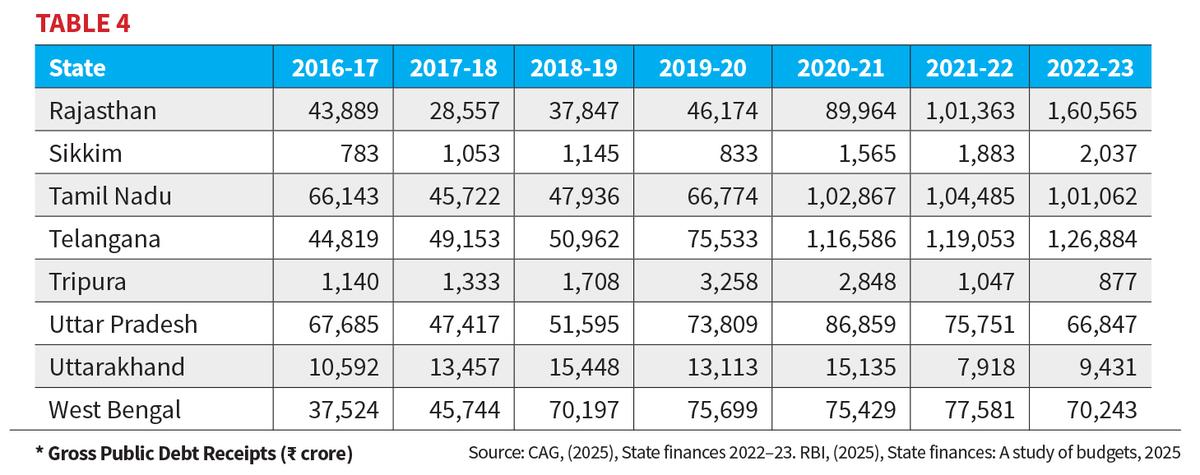 तालिका 4 राजस्थान, सिक्किम, तमिलनाडु, तेलंगाना, त्रिपुरा, उत्तर प्रदेश, उत्तराखंड और पश्चिम बंगाल को दिखाते हैं। राजस्थान और तमिलनाडु भारी उधारकर्ताओं के रूप में उभरे। राजस्थान ने अपने उधार को 2016-17 में ₹ 43,889 करोड़ से लेकर 2022-23 में ₹ 1,60,565 करोड़ कर दिया, जो देशव्यापी सबसे अधिक पर्वतों में से एक था, और इसकी देयता GSDP के लगभग 40% तक चढ़ गई। तमिलनाडु लगातार ₹ 66,143 करोड़ से ऊपर की ओर बढ़ गया, ₹ 1,01,062 करोड़, जबकि इसका ऋण अनुपात लगभग 33%हो गया। तेलंगाना ₹ 44,819 करोड़ से बढ़कर ₹ 1,26,884 करोड़ हो गया, सोचा कि मजबूत वृद्धि ने अपने दायित्व को लगभग 28%पर रखा।