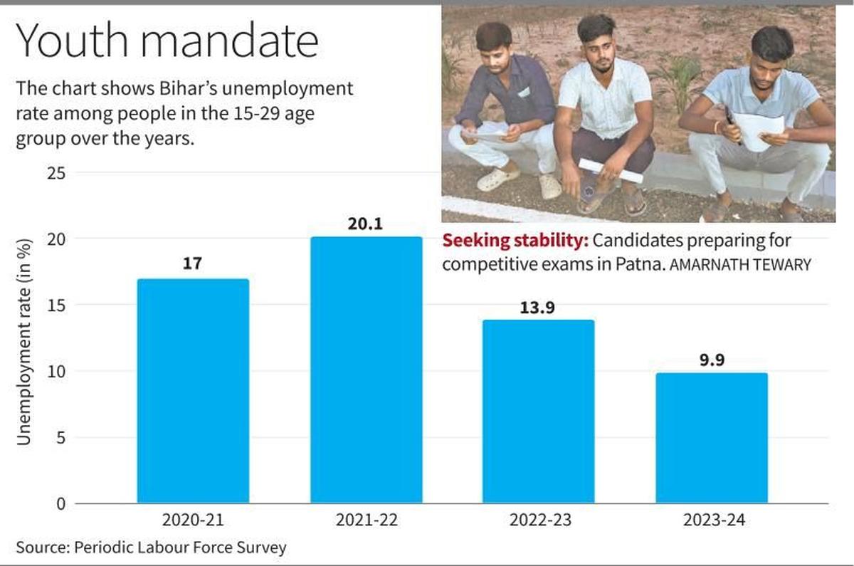 मतदाताओं के इस महत्वपूर्ण समूह को लुभाने के लिए, सत्तारूढ़ एनडीए और विपक्षी गठबंधन दोनों बेरोजगार युवाओं को रोजगार प्रदान करने के अपने वादों को उजागर कर रहे हैं। नीतीश कुमार के नेतृत्व वाली एनडीए सरकार ने हाल ही में दावा किया है कि वह विभिन्न क्षेत्रों में नौकरियों के लिए लाखों नियुक्ति पत्र वितरित कर रही है, मुख्यमंत्री ने कई कार्यक्रमों में वादा किया है कि “भविष्य में एक करोड़ और नौकरियां दी जाएंगी”।