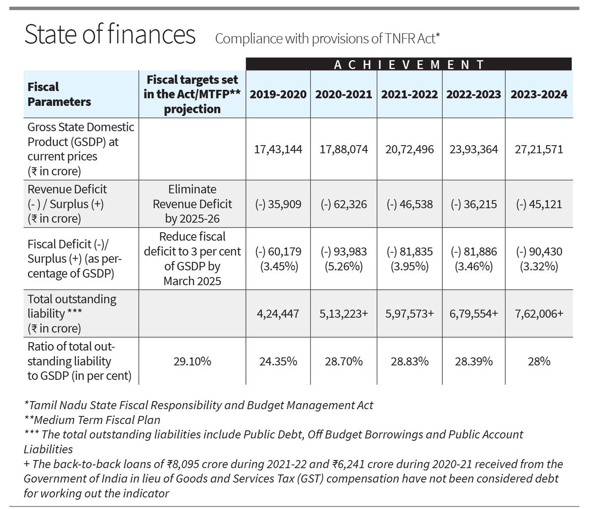 भारत के नियंत्रक एवं महालेखा परीक्षक (CAG) ने आकलन किया है कि तमिलनाडु सरकार ने 2023-24 के दौरान राजकोषीय संकेतकों के क्षेत्र में निर्धारित तीन लक्ष्यों में से केवल एक में सुधार दिखाया है।