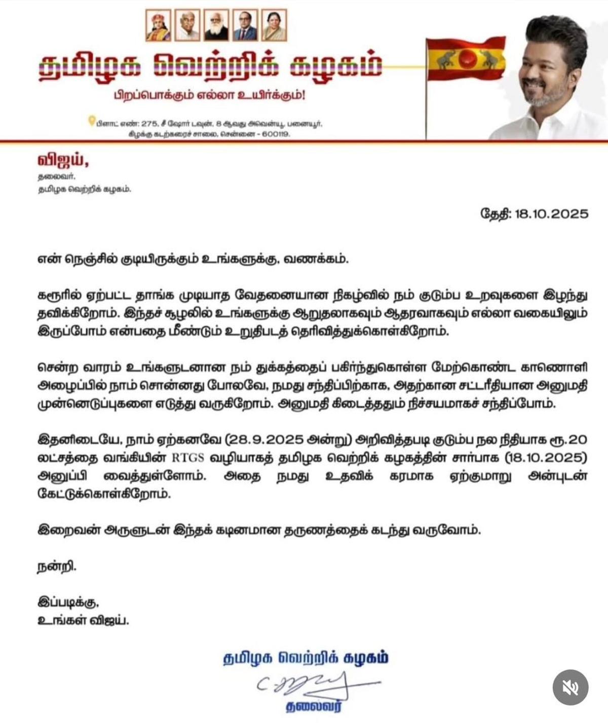 18 अक्टूबर, 2025 (शनिवार) को लिखे पत्र में, श्री विजय ने कहा कि वह आवश्यक कानूनी औपचारिकताएं पूरी करने के बाद पीड़ितों के परिवारों से मिलेंगे। उन्होंने अपनी संवेदना व्यक्त की और शोक संतप्त परिवारों को पार्टी के समर्थन की पुष्टि की। पत्र में लिखा है, “जैसा कि वीडियो कॉल के दौरान कहा गया था, हम जल्द ही आपसे व्यक्तिगत रूप से मिलने के लिए कानूनी औपचारिकताएं पूरी कर रहे हैं। इस बीच, जैसा कि पहले घोषणा की गई थी, टीवीके की ओर से परिवार कल्याण सहायता के रूप में ₹20 लाख की राशि हस्तांतरित की गई है।”