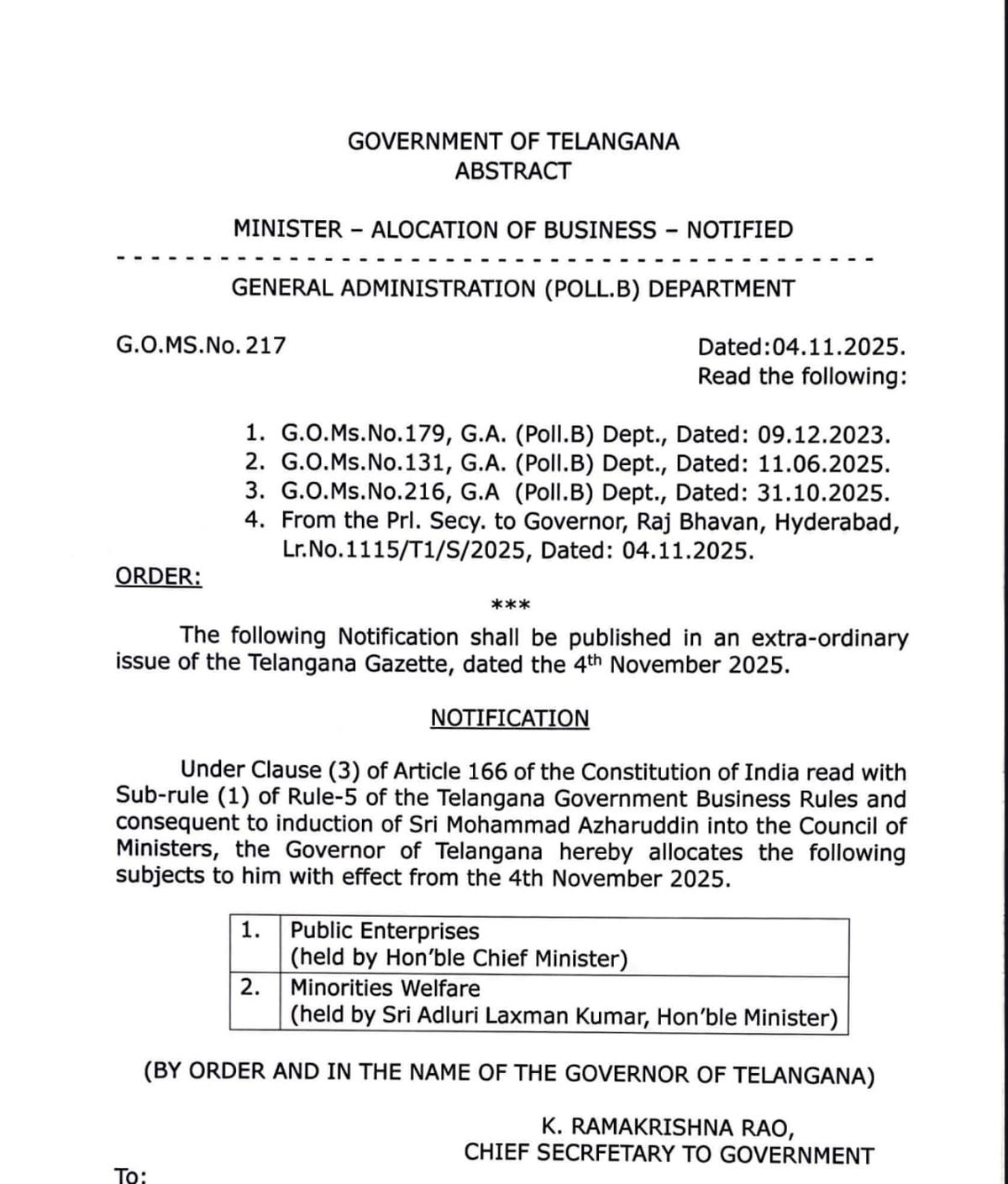 को अल्पसंख्यक कल्याण और सार्वजनिक उद्यम विभाग आवंटित करने के आदेश जारी किए गए नवनियुक्त तेलंगाना मंत्री मोहम्मद अज़हरुद्दीन मंगलवार (4 नवंबर, 2025) को। उन्होंने 31 अक्टूबर, 2025 को शपथ ली थी। जबकि अल्पसंख्यक कल्याण मंत्री अदलुरी लक्ष्मण कुमार के पास थे, सार्वजनिक उद्यम विभाग मुख्यमंत्री ए रेवंत रेड्डी के पास था। आदेश के अनुसार राज्यपाल ने श्री अज़हरुद्दीन को दो विभाग आवंटित किये। वह तेलंगाना कैबिनेट में 16वें मंत्री हैं।