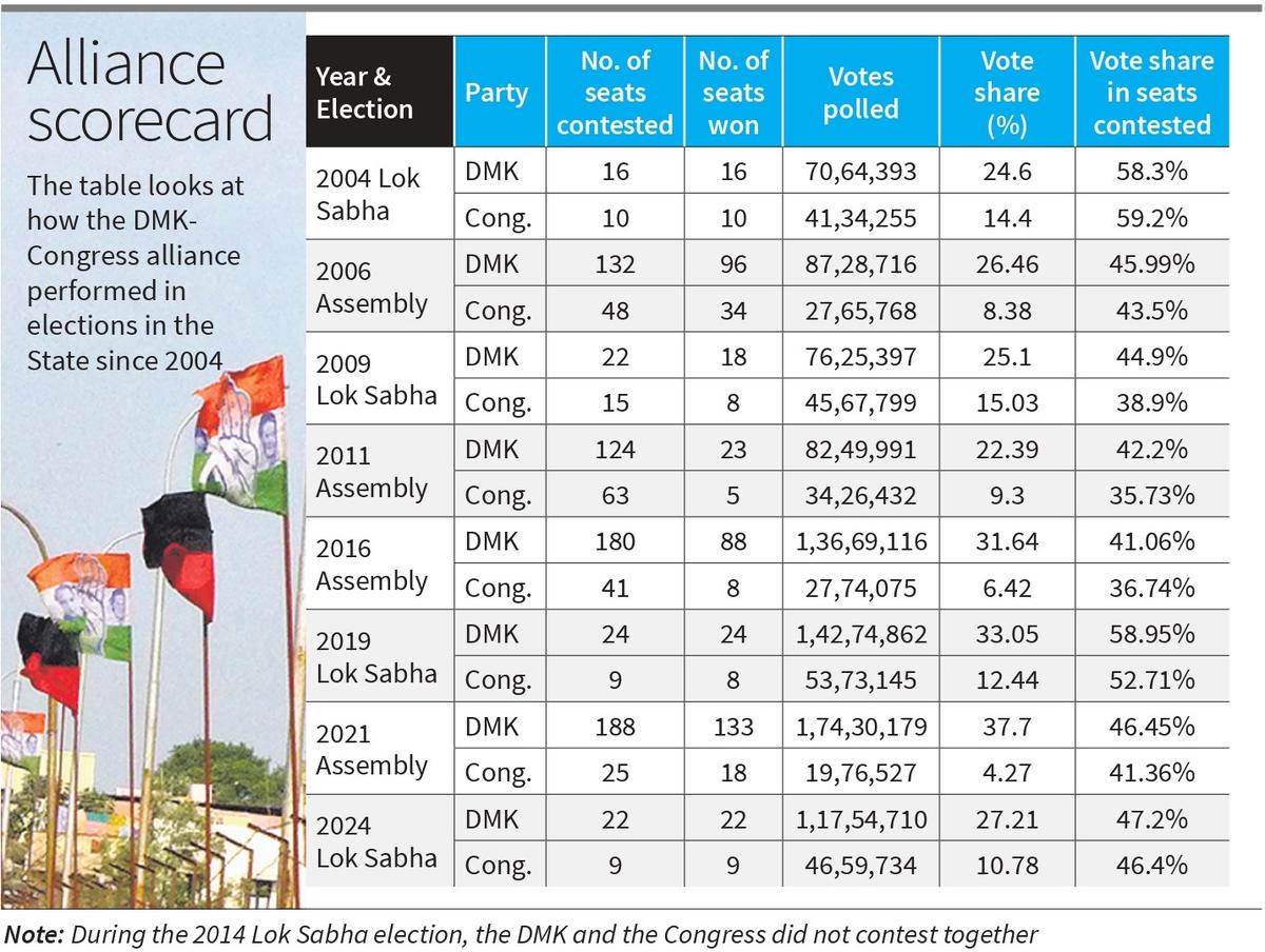 2024 के लोकसभा चुनाव में, भले ही कांग्रेस चुनाव लड़ी गई सीटों पर वोट शेयर के मामले में डीएमके से पिछड़ गई, लेकिन मार्जिन एक प्रतिशत से भी कम था। अन्य सभी अवसरों पर, अंतर लगभग दो प्रतिशत अंक (2006 विधानसभा चुनाव) से लेकर 6.47 प्रतिशत अंक (2001 विधानसभा चुनाव) तक था।