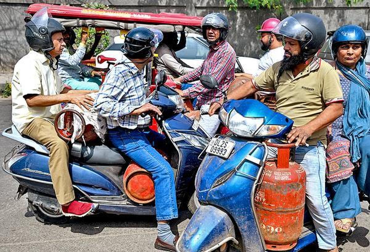 स्टॉक करना: लोग नई दिल्ली के एक डिपो से अपने दोपहिया वाहनों पर एलपीजी सिलेंडर घर ले जाते हैं।