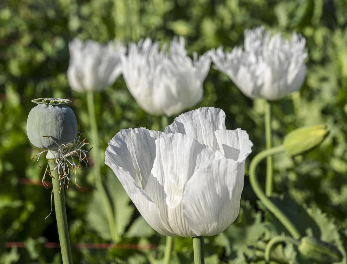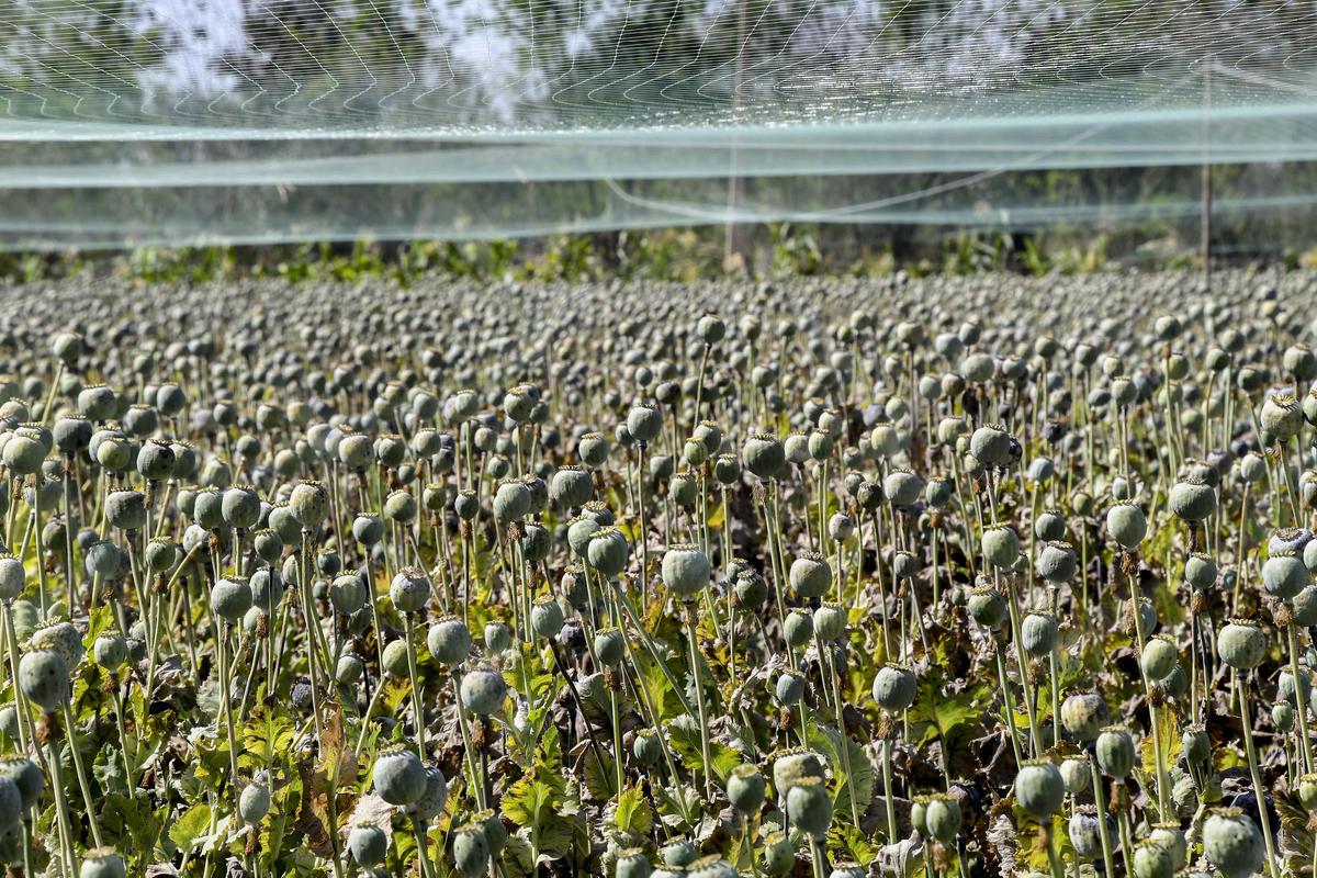 छिपी हुई सतर्कता: सुरक्षा जाल से ढके हुए अफीम के खेत में पूरी तरह से विकसित पोस्ता कैप्सूल।