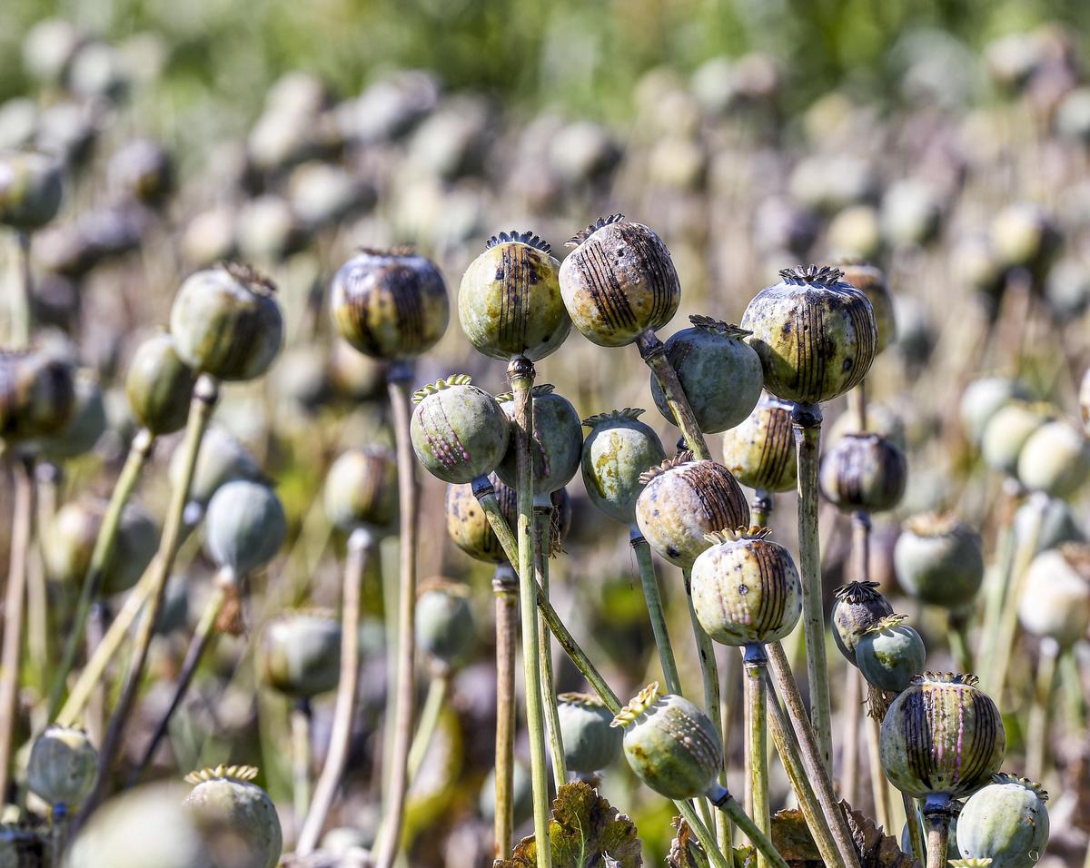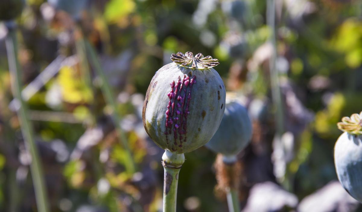 आवश्यक अमृत: अफ़ीम के खेत में खसखस के कैप्सूल से कच्चा अफ़ीम लेटेक्स निकल रहा है। लेटेक्स की खरीद सीबीएन द्वारा की जाती है।