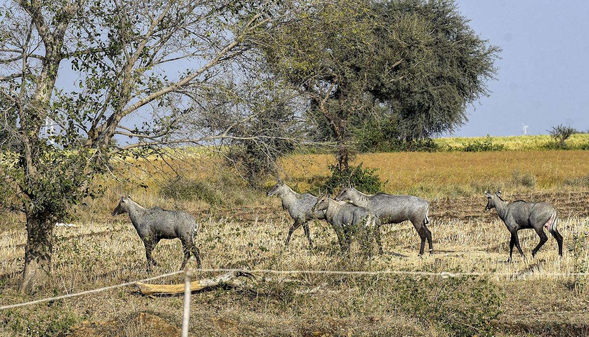 बिन बुलाए मेहमान: मध्य प्रदेश के नीमच जिले के एक खेत में नीलगाय। किसानों को अफ़ीम के पौधे खाने से रोकने के लिए विभिन्न सुरक्षा उपाय करने पड़ते हैं।