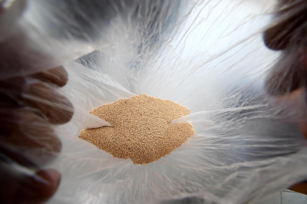 ठंडी उपज: एक अफीम किसान नीमच जिले में अफीम पोस्त से प्राप्त पोस्ता दाना (पोस्तो दाना या खस खस) दिखाता हुआ।